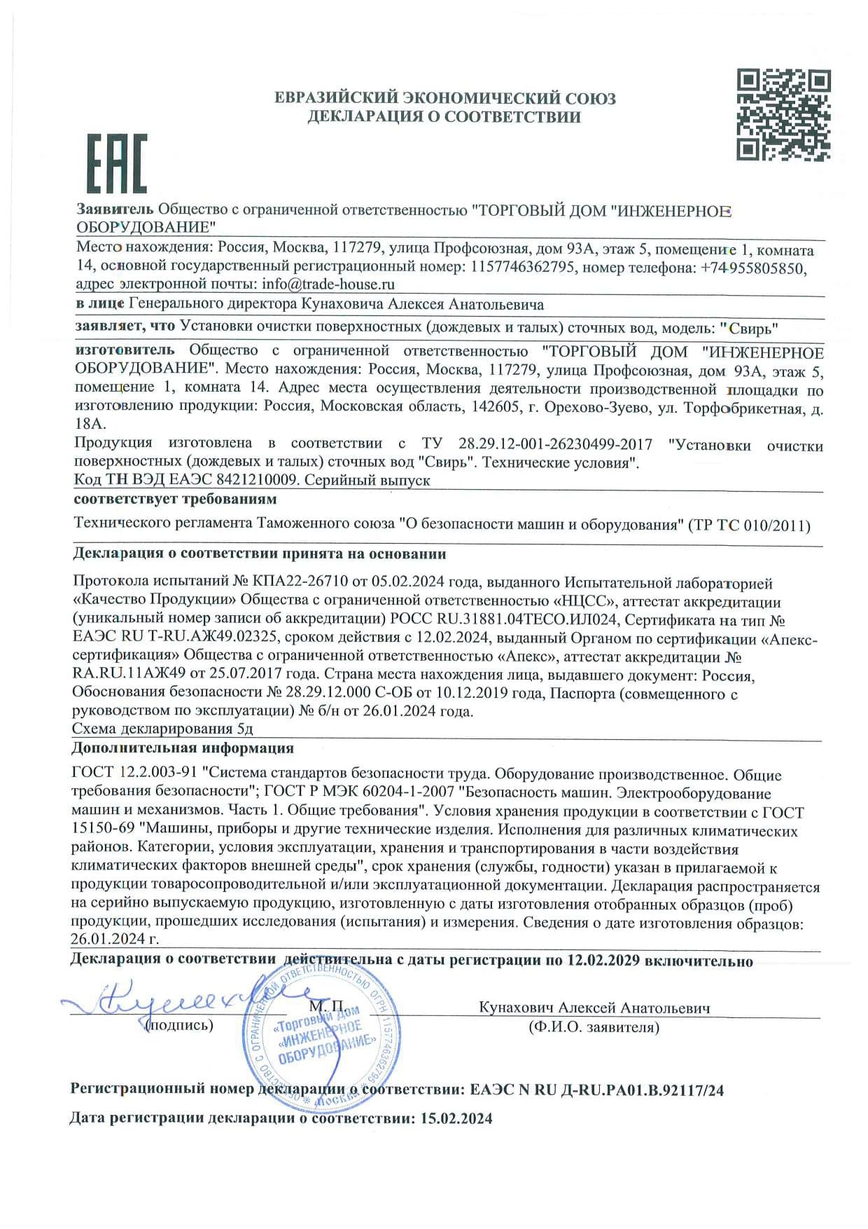 "СВИРЬ" - современная установка очистки стоков талых и ливневых вод. Область применения оборудования – жилой сектор, автозаправки, промышленные объекты и пр. Система выполняет комплексную фильтрацию от разных загрязнений.